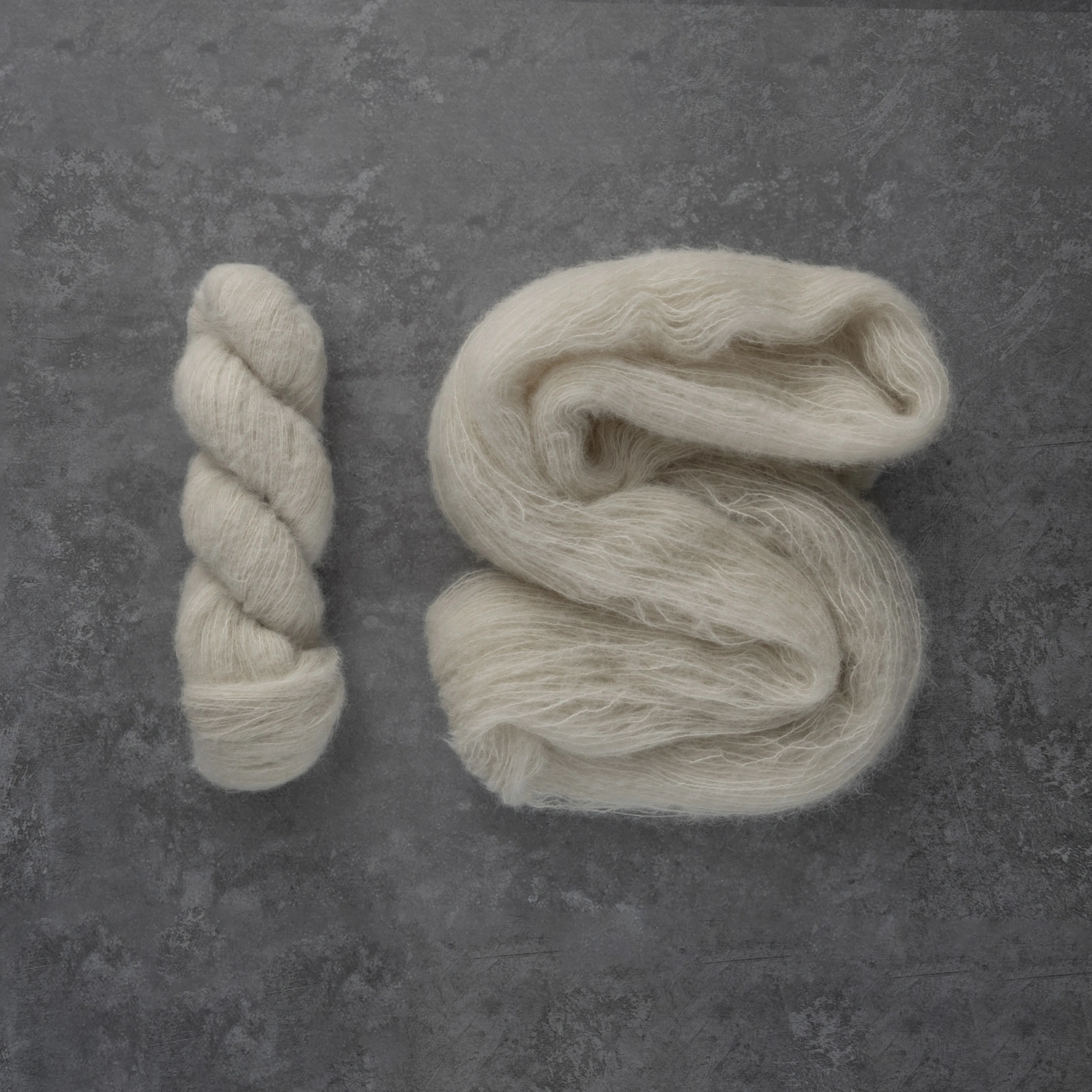 Like the feathers of a bird, Quill has a majestic buoyancy that seems to defy gravity. Spun from a blend of soft Baby Suri Alpaca and Mulberry Silk, Quill gets its beautiful, fluffy loft thanks to the brushing process applied to the yarn. Quill is a lace weight yarn, but it looks equally spectacular knit up airy and open on big needles. You can use Quill stranded together with other yarns to add fuzz, like you would use mohair, or try it solo. Quill is a versatile canvas for all things soft and fuzzy your imagination conjures up!